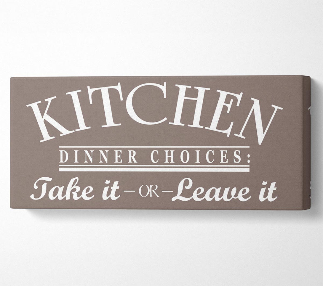 Küchenzitat „Dinner Choices“ auf beigefarbener Leinwand, gedruckt auf beschichteter Polyester-Leinwand. Auf einem 44 mm großen Kastenrahmen montiert, fertig zum Aufhängen.