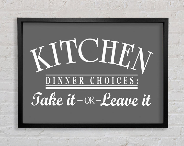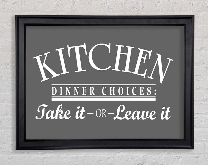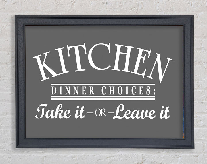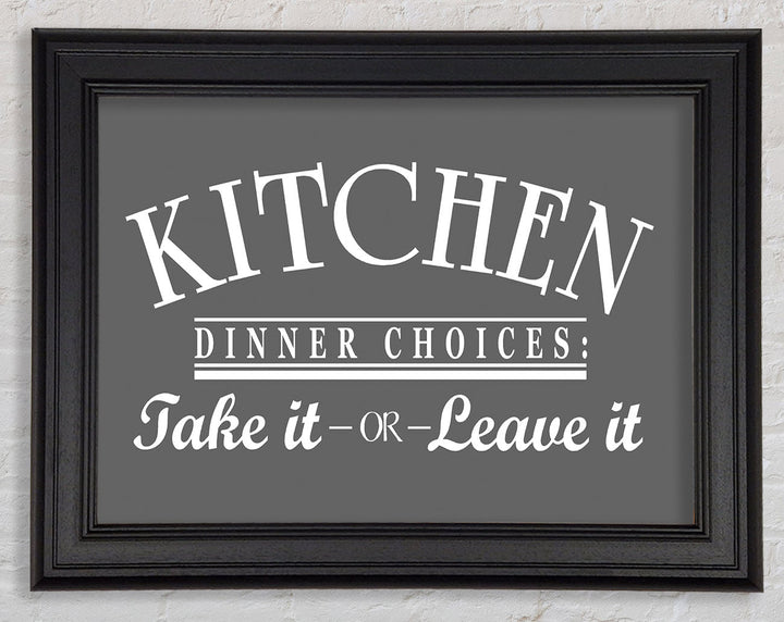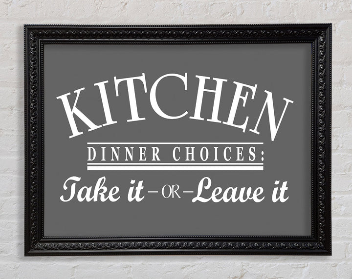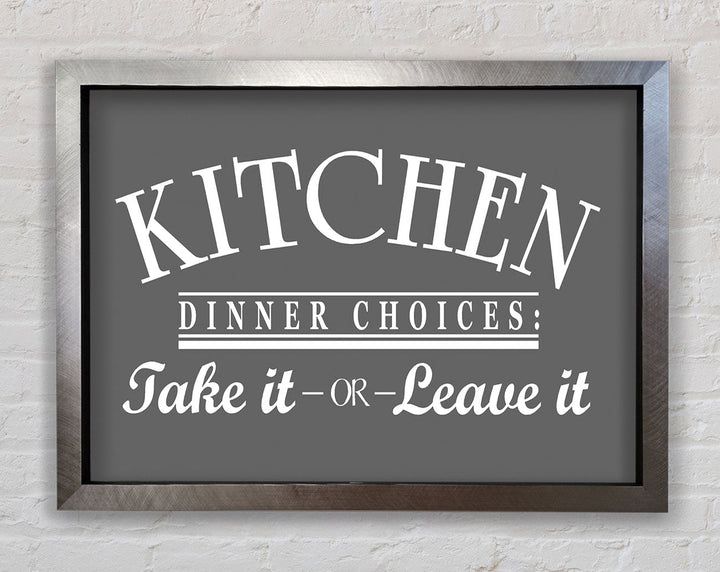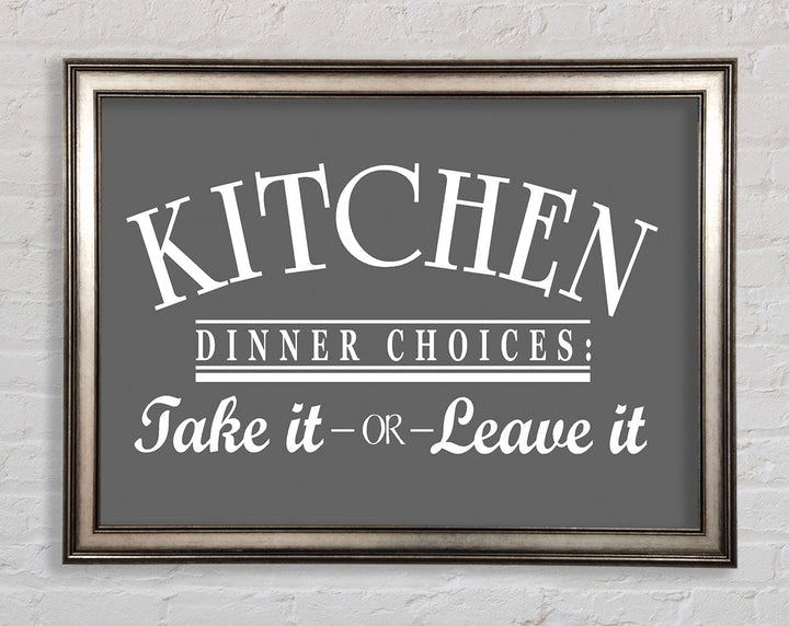 Grau gerahmter Druck mit Küchenzitat „Dinner Choices“, erhältlich in mehreren Rahmenfarben. Fertig zum Aufhängen aus der Schachtel und handgefertigt im Vereinigten Königreich.
