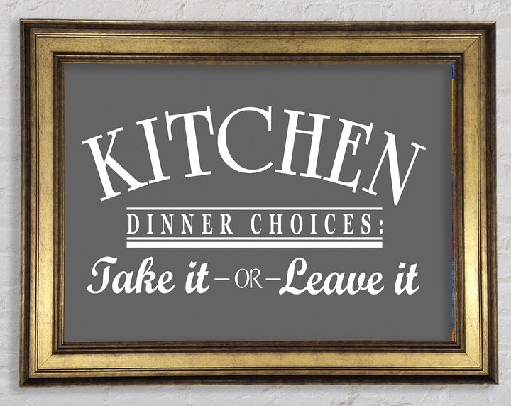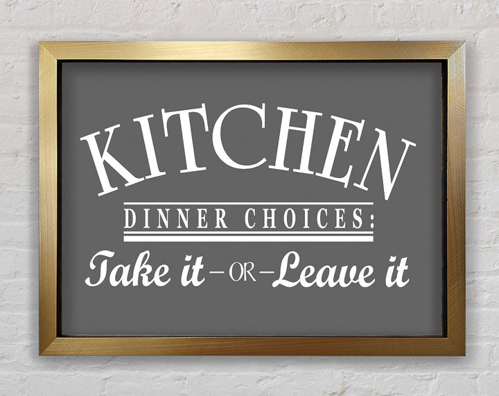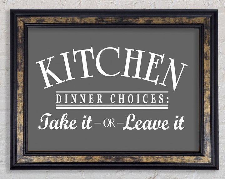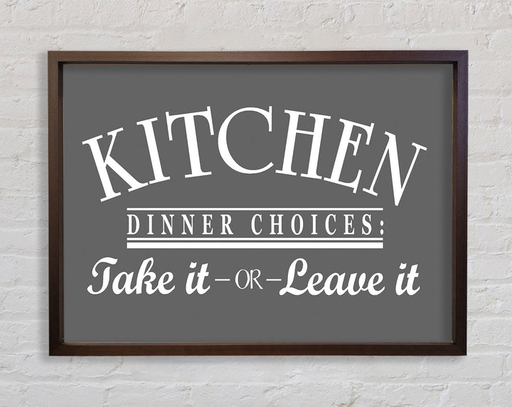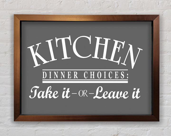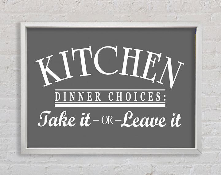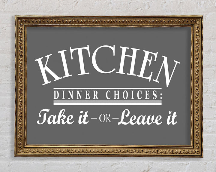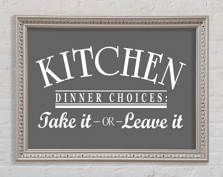 Grau gerahmter Druck mit Küchenzitat „Dinner Choices“, erhältlich in mehreren Rahmenfarben. Fertig zum Aufhängen aus der Schachtel und handgefertigt im Vereinigten Königreich.