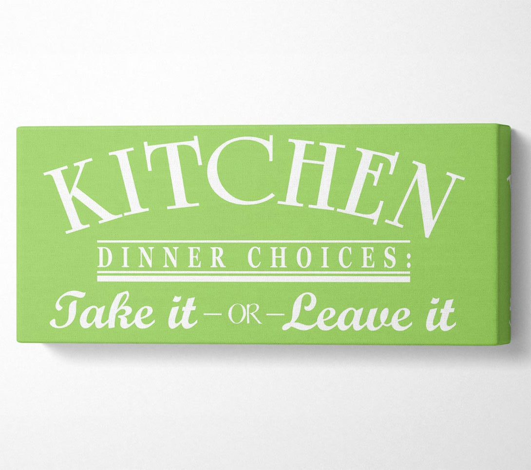 Küchenzitat „Dinner Choices“ auf limettengrüner Leinwand, gedruckt auf beschichteter Polyester-Leinwand. Auf einem 44 mm großen Kastenrahmen montiert, fertig zum Aufhängen.