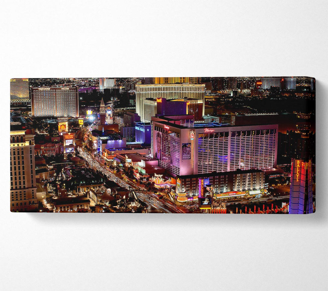 Leinwandbild „Las Vegas Strip Night Lights“, gedruckt auf beschichtetem Polyester-Canvas. Auf einem 44 mm großen Kastenrahmen montiert, fertig zum Aufhängen.