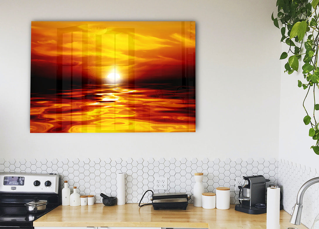 Acryldruck „Lava Ocean Sunset Yellow“, UV-gedruckt auf 5 mm dickes Acrylglas. Wird mit allem geliefert, was Sie zum Aufhängen an die Wand brauchen.