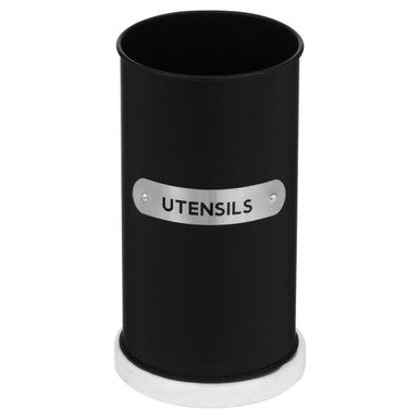 This utensil holder has a black enamel body featuring a silver finish metal Utensil plaque and a white marble base. The monochrome colour scheme and modern design make it a stylish addition to the kitchen.