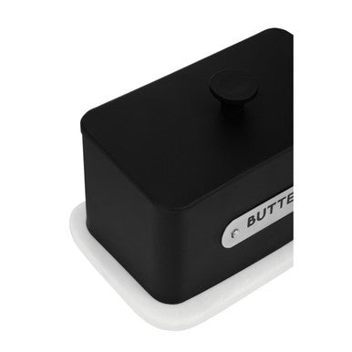 This butter dish has a black enamel lid featuring a silver finish metal Butter plaque and a white marble base. The monochrome colour scheme and modern design make it a stylish addition to the kitchen.