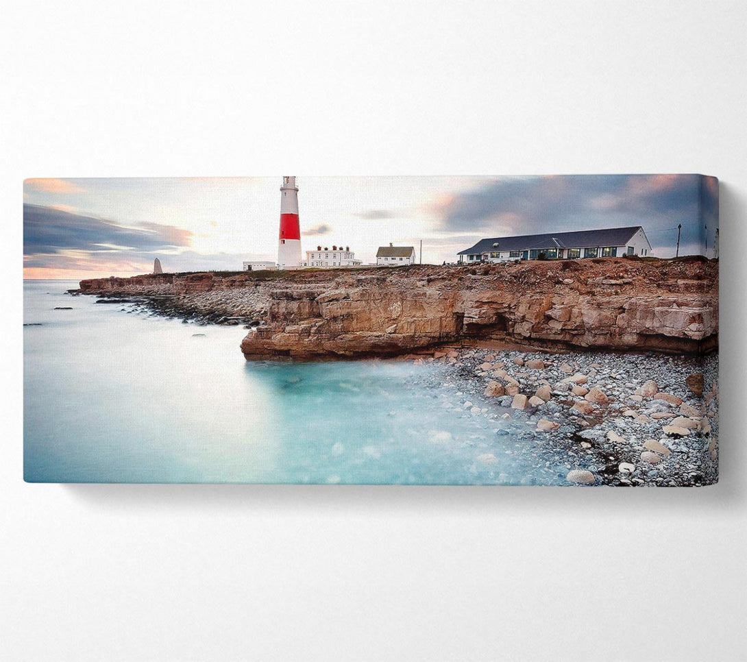 Leinwandbild „Lighthouse Ocean Rocks“, gedruckt auf beschichteter Polyester-Leinwand. Auf einem 44 mm großen Kastenrahmen montiert, fertig zum Aufhängen.