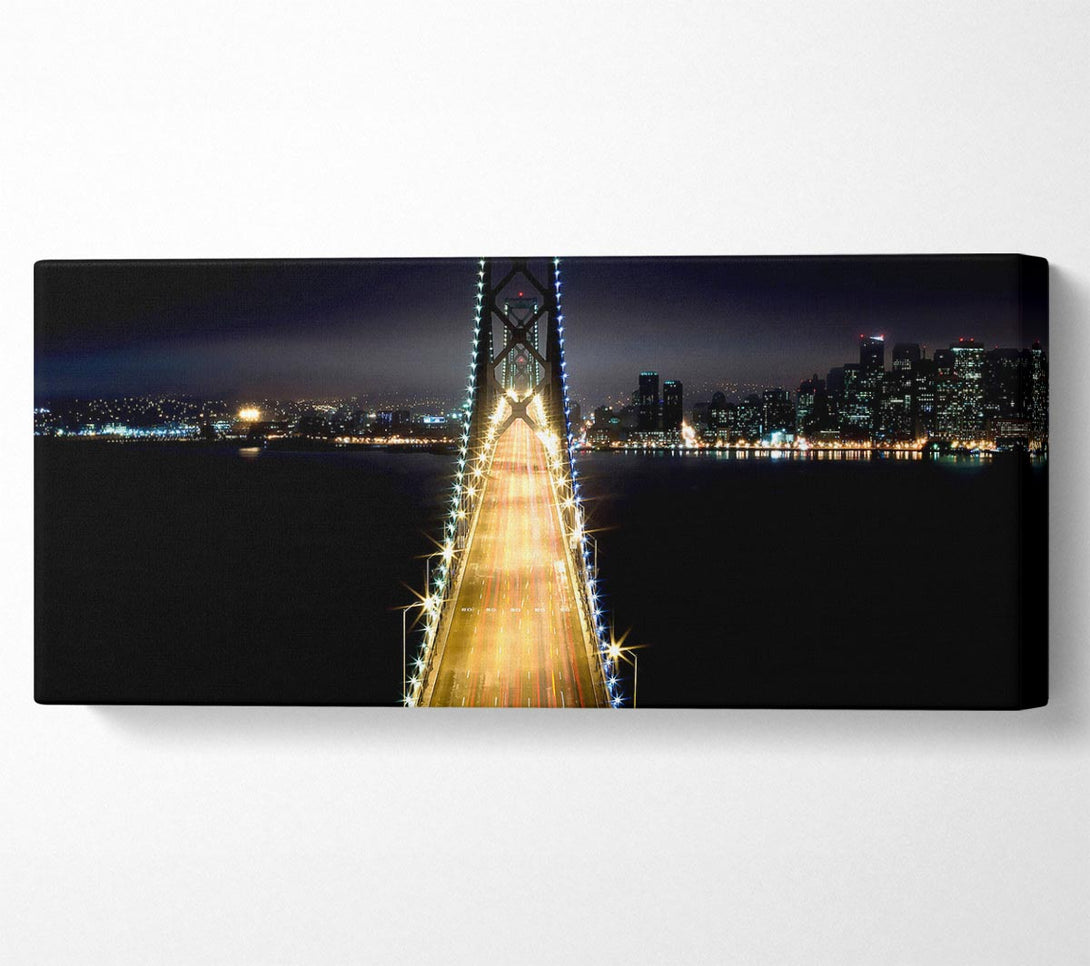 Lichter auf der Bay Bridge-Leinwand, gedruckt auf beschichteter Polyester-Leinwand. Auf einem 44 mm großen Kastenrahmen montiert, fertig zum Aufhängen.