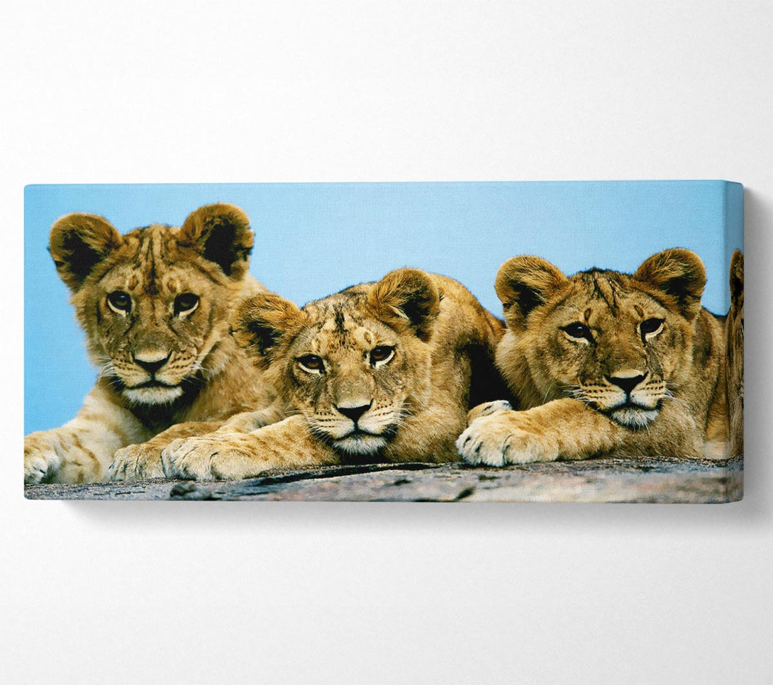 Leinwandbild „Löwenjunges Trio“, gedruckt auf beschichteter Polyester-Leinwand. Auf einem 44 mm großen Kastenrahmen montiert, fertig zum Aufhängen.