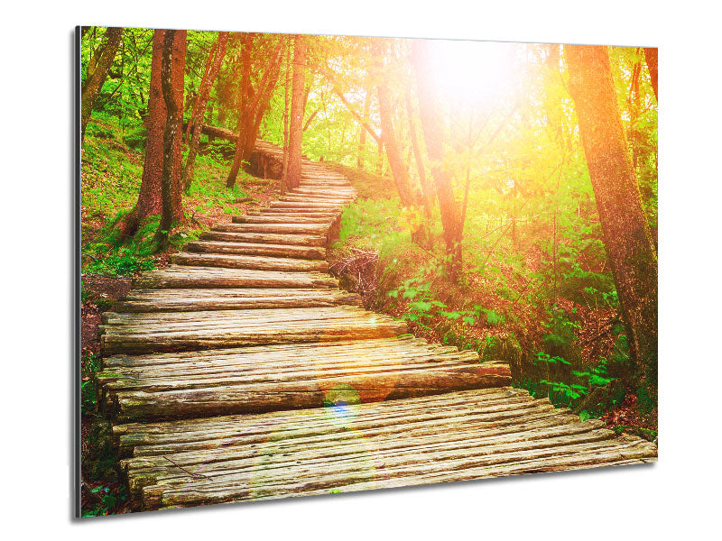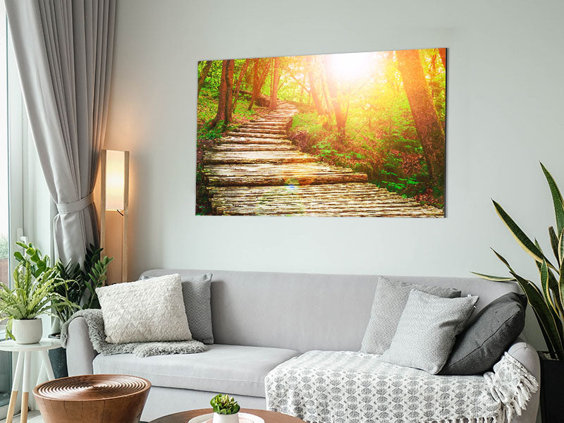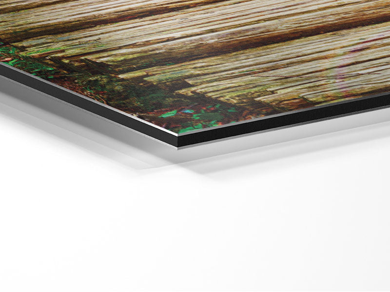 Baumstammpfad durch den Wald. Gedruckt auf gebürstetem Aluminium-Dibond. Eine moderne Art, Kunst zu präsentieren und leicht zu pflegen.