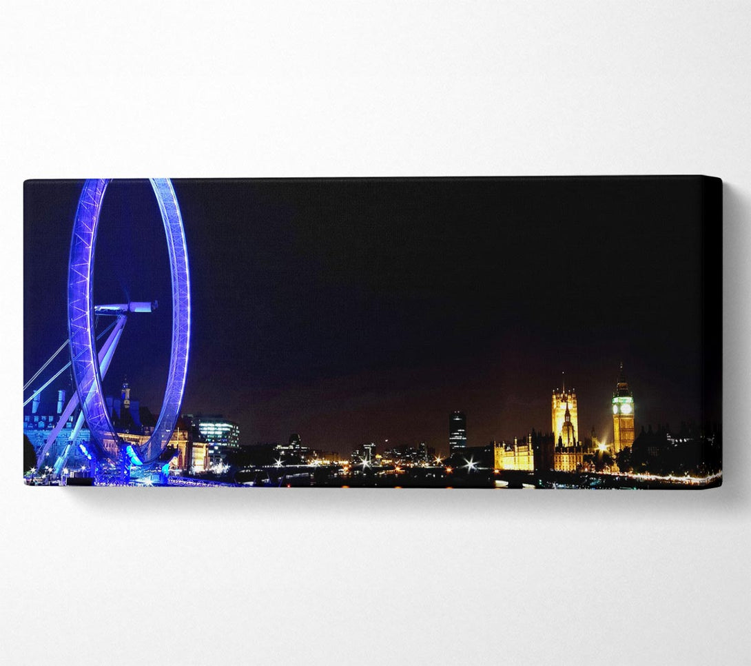 London Eye Blue Uk-Leinwand, gedruckt auf beschichteter Polyester-Leinwand. Auf einem 44 mm großen Kastenrahmen montiert, fertig zum Aufhängen.