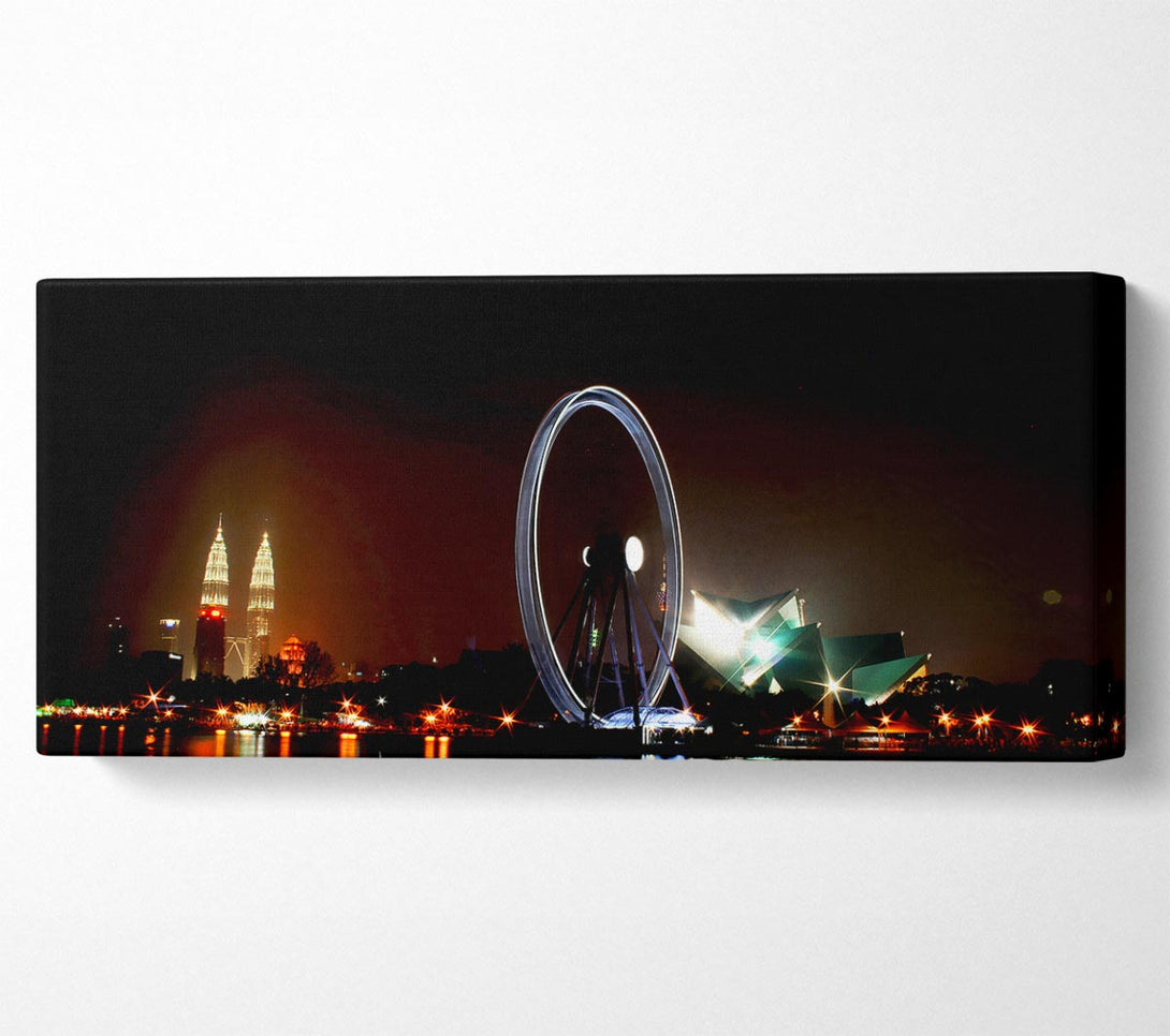 Leinwandbild „London Eye über der Themse“, gedruckt auf beschichtetem Polyester-Canvas. Auf einem 44 mm breiten Kastenrahmen montiert, fertig zum Aufhängen.