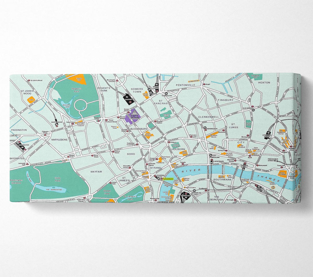 Leinwandbild mit London-Karte, gedruckt auf beschichteter Polyester-Leinwand. Auf einem 44 mm großen Kastenrahmen montiert, fertig zum Aufhängen.