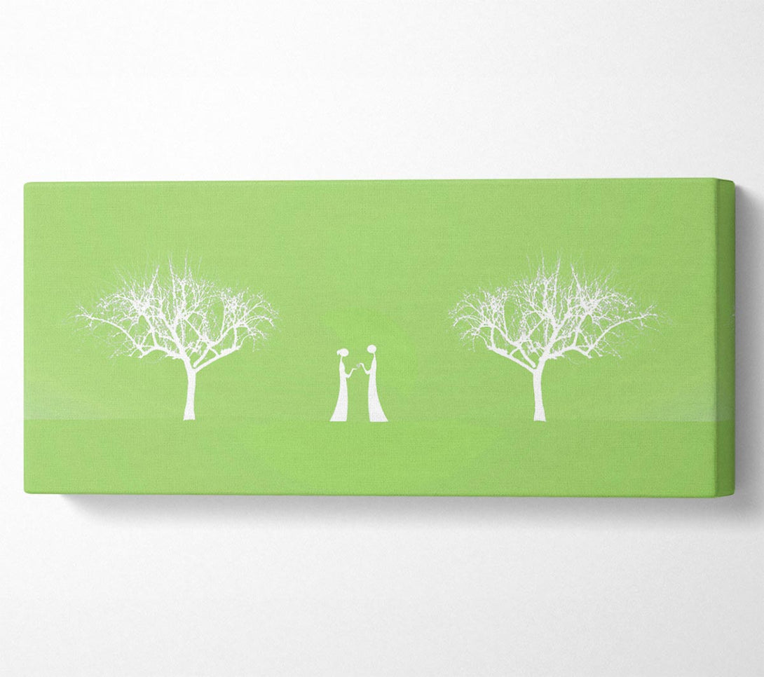 Liebe zwischen den Bäumen und dem Mond, hellgrüne Leinwand, gedruckt auf beschichteter Polyester-Leinwand. Auf einem 44 mm großen Kastenrahmen montiert, fertig zum Aufhängen.