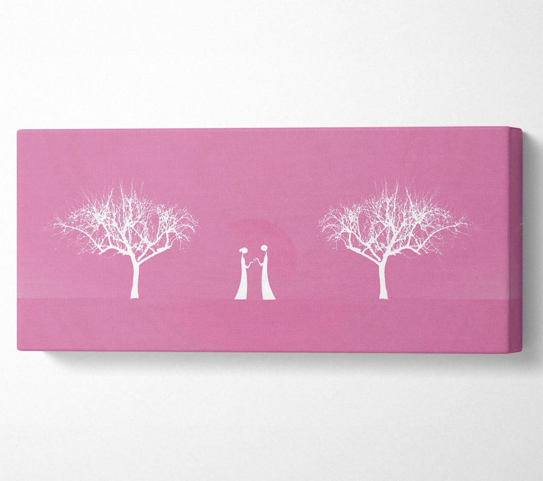 Liebe zwischen den Bäumen und dem Mond. Rosa Leinwand, gedruckt auf beschichteter Polyester-Leinwand. Auf einem 44 mm großen Kastenrahmen montiert, fertig zum Aufhängen.
