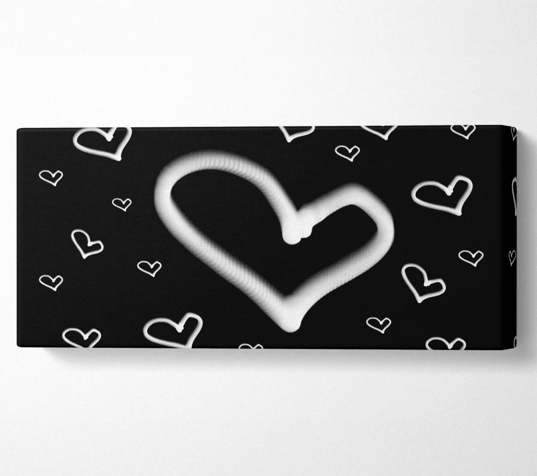 Love Hearts Weiß auf schwarzer Leinwand, gedruckt auf beschichteter Polyester-Leinwand. Auf einem 44 mm großen Kastenrahmen montiert, fertig zum Aufhängen.