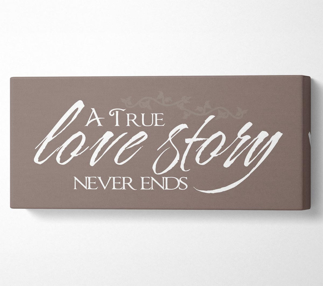 Liebeszitat „Eine wahre Liebesgeschichte endet nie“. Beige Leinwand, gedruckt auf beschichteter Polyester-Leinwand. Auf einem 44 mm großen Kastenrahmen montiert, fertig zum Aufhängen.