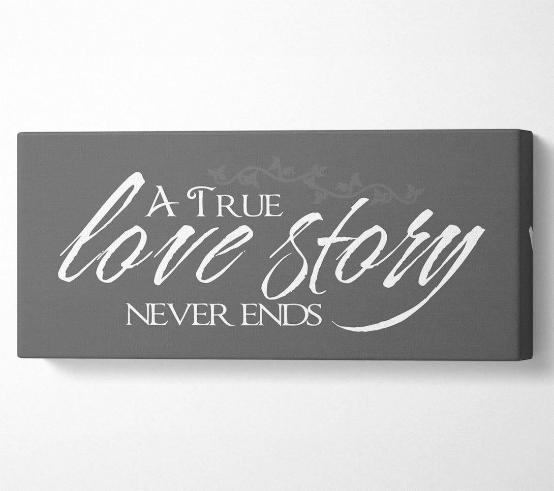 Liebeszitat „Eine wahre Liebesgeschichte endet nie“ – graue Leinwand, gedruckt auf beschichteter Polyester-Leinwand. Auf einem 44 mm großen Kastenrahmen montiert, fertig zum Aufhängen.