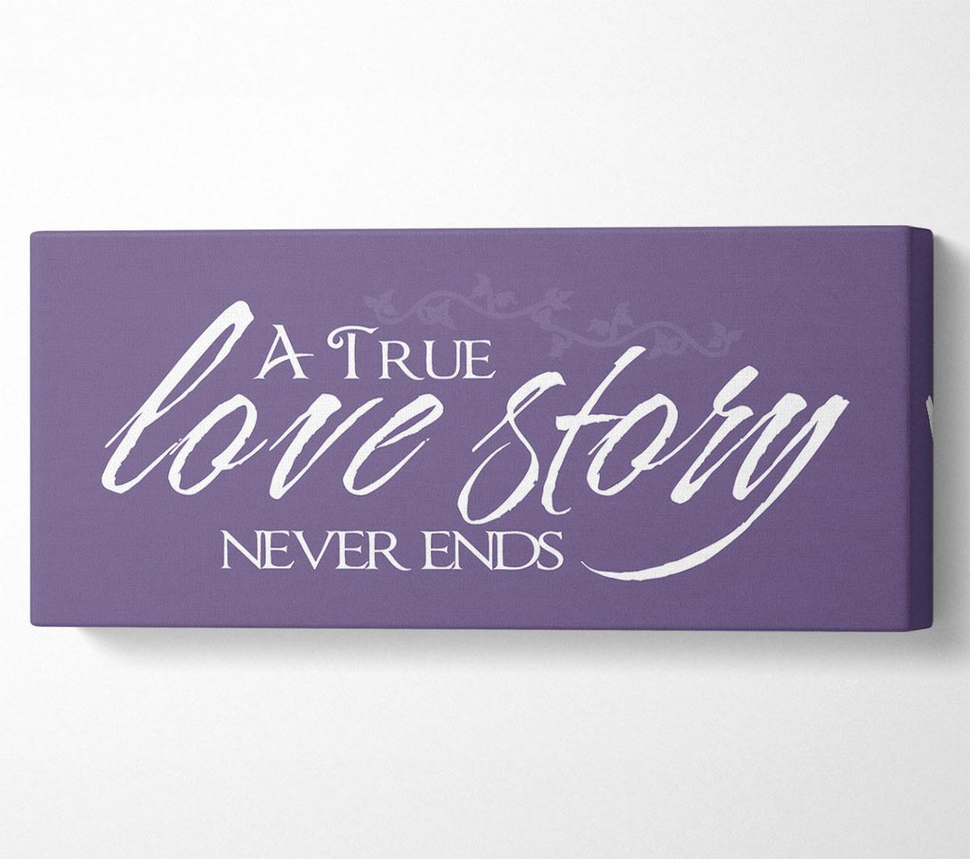 Liebeszitat „Eine wahre Liebesgeschichte endet nie“ Lila Leinwand, gedruckt auf beschichteter Polyester-Leinwand. Auf einem 44 mm großen Kastenrahmen montiert, fertig zum Aufhängen.
