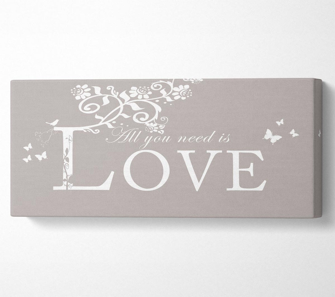 Liebeszitat „All You Need Is Love“ auf beigefarbener Leinwand, gedruckt auf beschichteter Polyester-Leinwand. Auf einem 44 mm großen Kastenrahmen montiert, fertig zum Aufhängen.