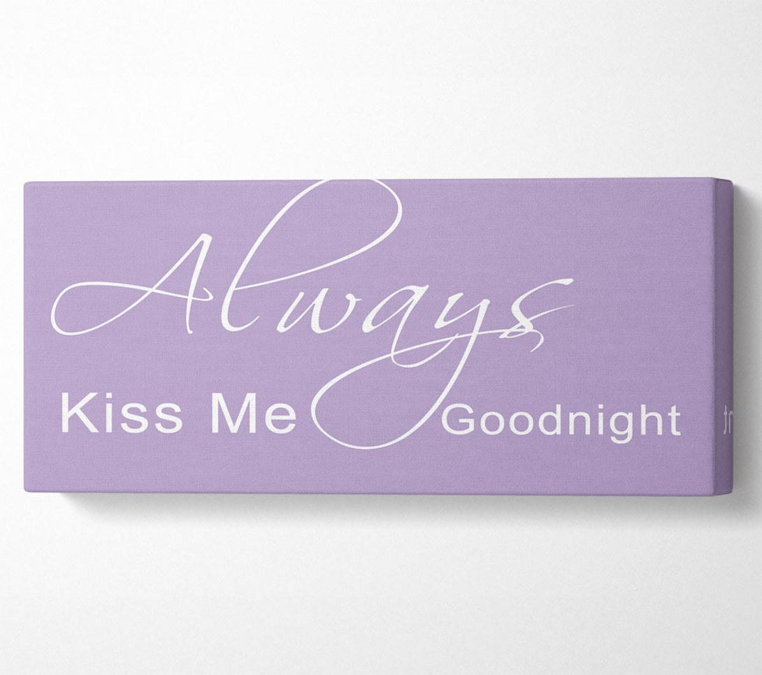 Liebeszitat „Always Kiss Me Goodnight 2“ auf lila Leinwand, gedruckt auf beschichteter Polyester-Leinwand. Auf einem 44 mm großen Kastenrahmen montiert, fertig zum Aufhängen.
