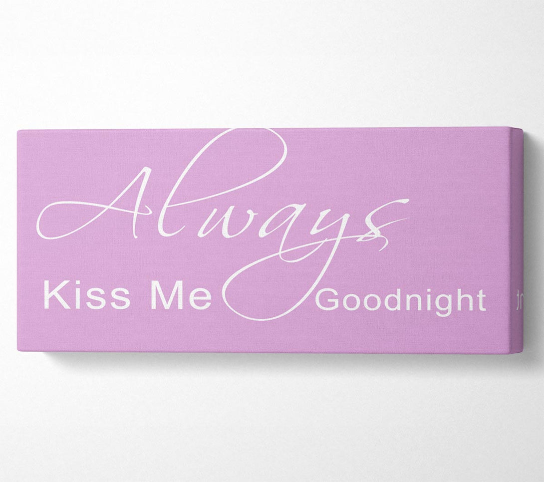 Liebeszitat „Always Kiss Me Goodnight 2“ auf rosa Leinwand, gedruckt auf beschichteter Polyester-Leinwand. Auf einem 44 mm großen Kastenrahmen montiert, fertig zum Aufhängen.