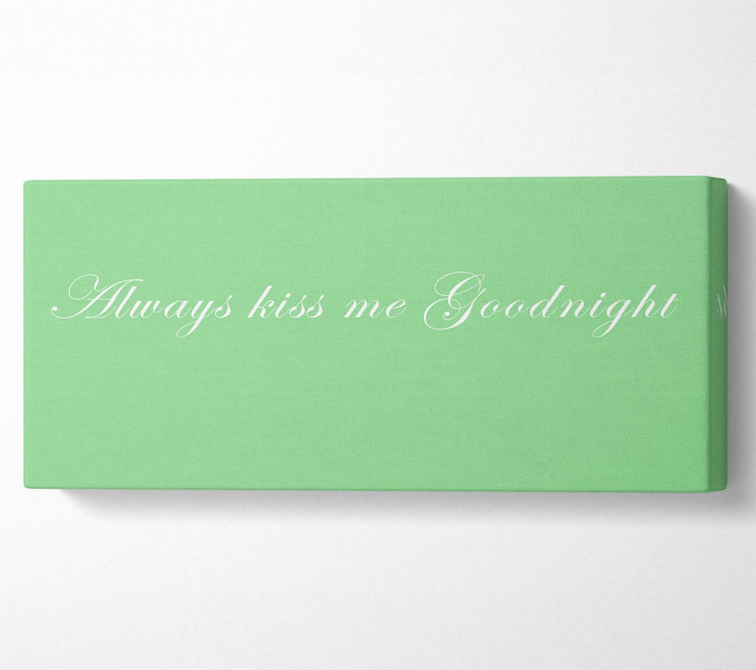 Liebeszitat „Always Kiss Me Goodnight“ auf grüner Leinwand, gedruckt auf beschichteter Polyester-Leinwand. Auf einem 44 mm großen Kastenrahmen montiert, fertig zum Aufhängen.