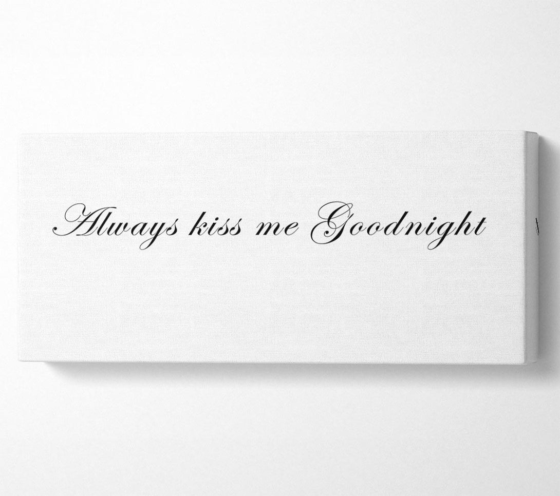 Liebeszitat „Always Kiss Me Goodnight“ – Weiße Leinwand, gedruckt auf beschichteter Polyester-Leinwand. Auf einem 44 mm großen Kastenrahmen montiert, fertig zum Aufhängen.