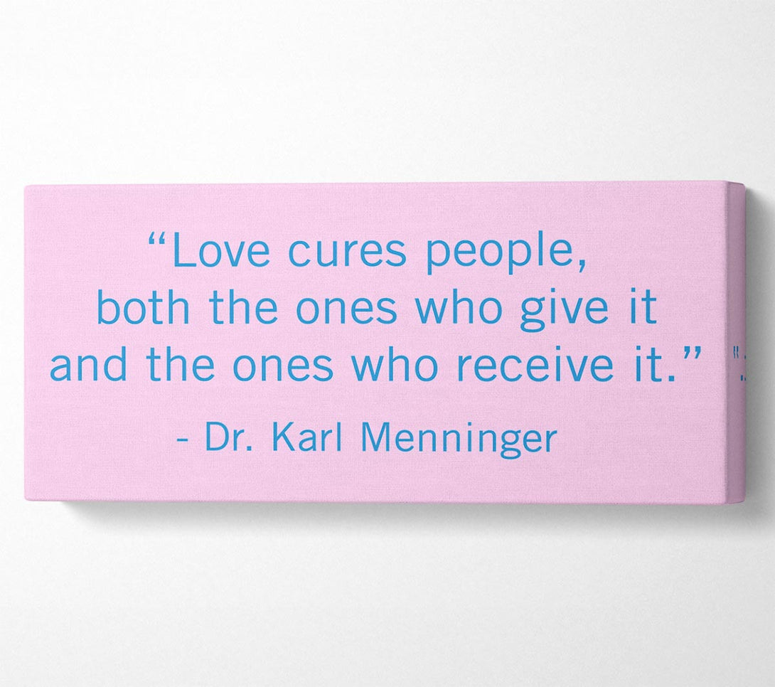 Liebeszitat „Love Cures People“ von Dr. Karl Menninger auf Leinwand, gedruckt auf beschichteter Polyester-Leinwand. Auf einem 44 mm großen Kastenrahmen montiert, fertig zum Aufhängen.