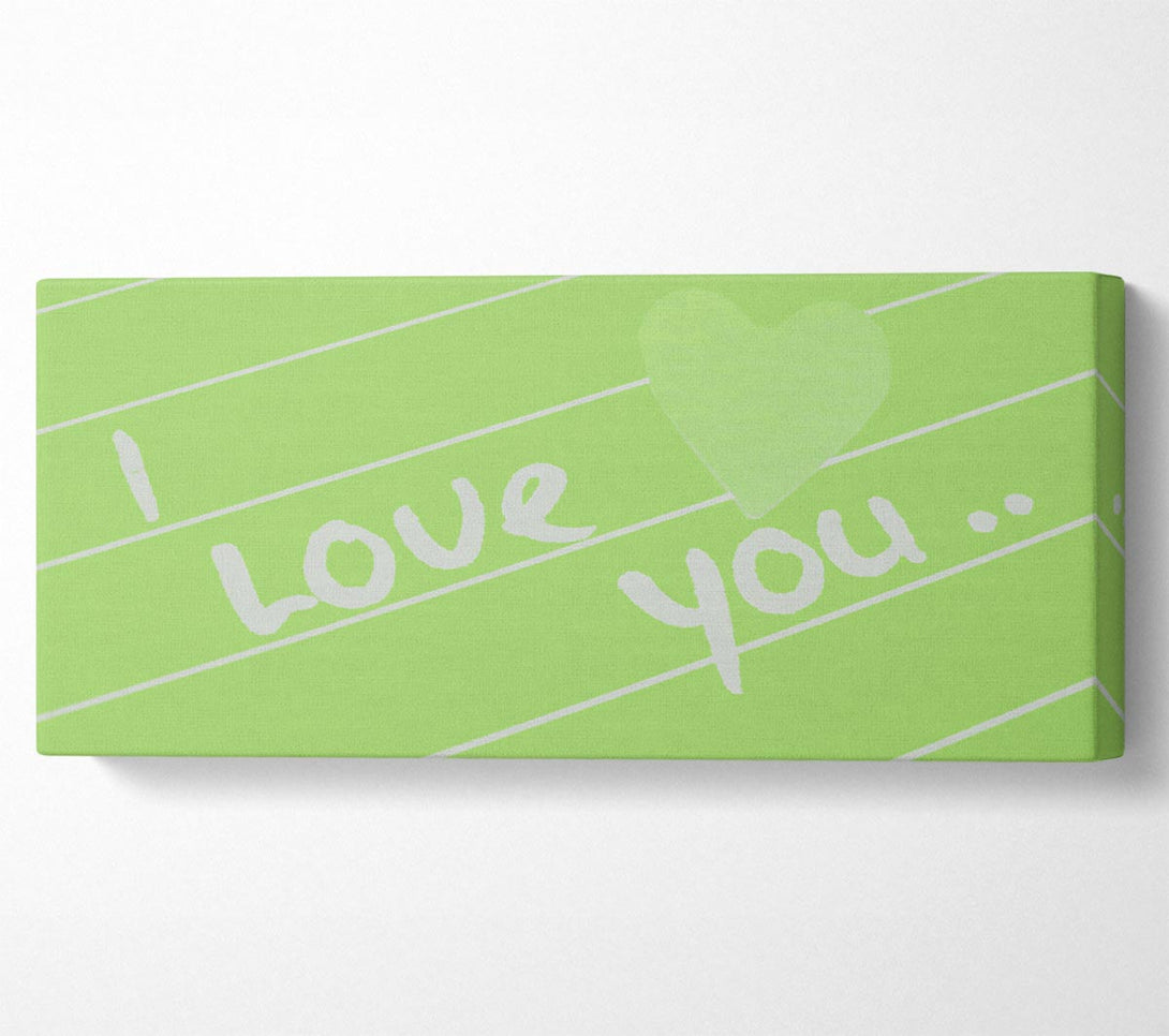 Liebeszitat „I Love You Heart“ in Limettengrün, gedruckt auf beschichteter Polyester-Leinwand. Auf einem 44 mm großen Kastenrahmen montiert, fertig zum Aufhängen.