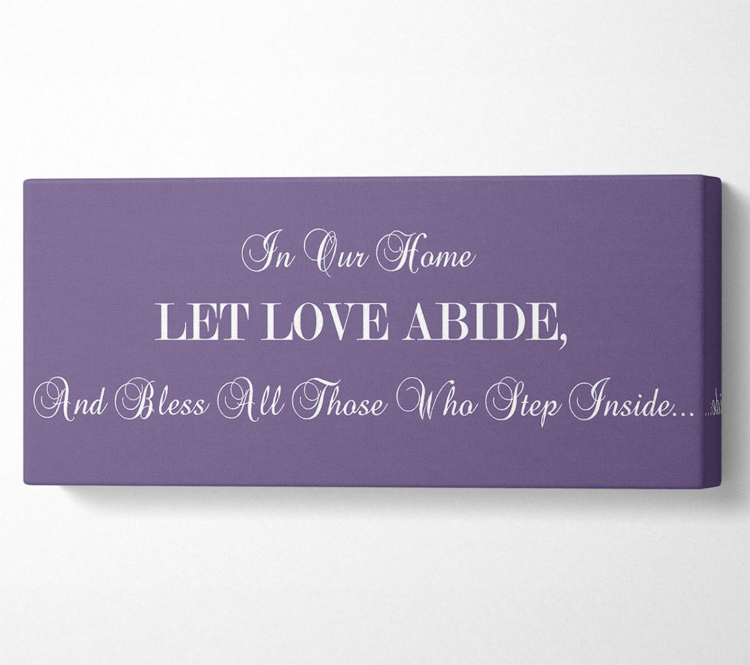 Liebeszitat „In unserem Zuhause, lass die Liebe bleiben“ auf lila Leinwand, gedruckt auf beschichteter Polyester-Leinwand. Auf einem 44 mm großen Kastenrahmen montiert, fertig zum Aufhängen.