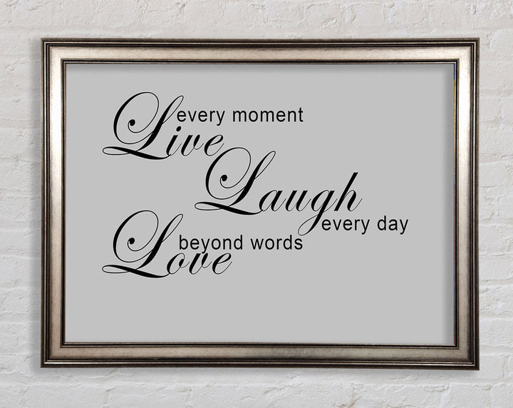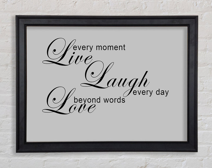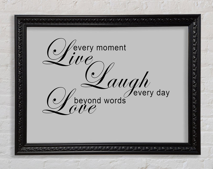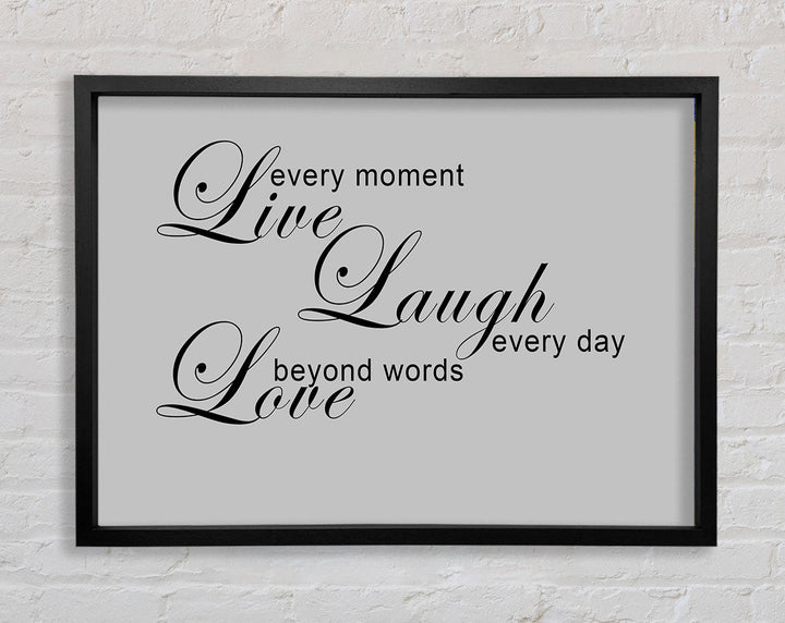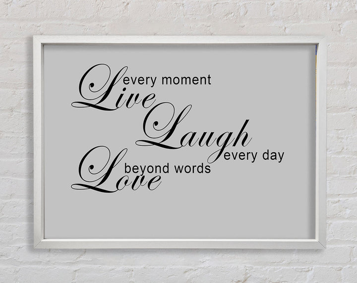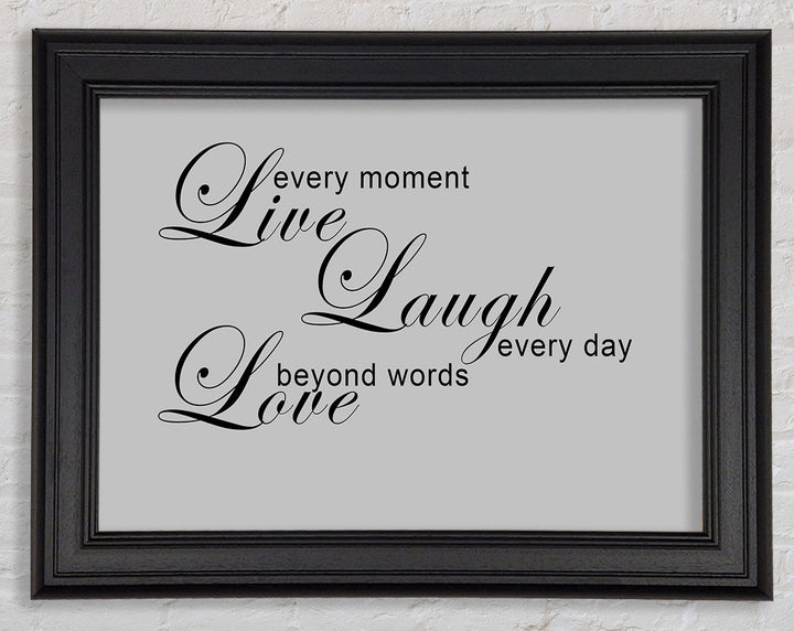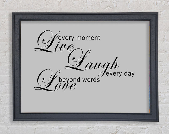 Liebeszitat „Live Every Moment 3“ – Grau gerahmter Druck, in mehreren Rahmenfarben erhältlich. Fertig zum Aufhängen aus der Schachtel und handgefertigt im Vereinigten Königreich.