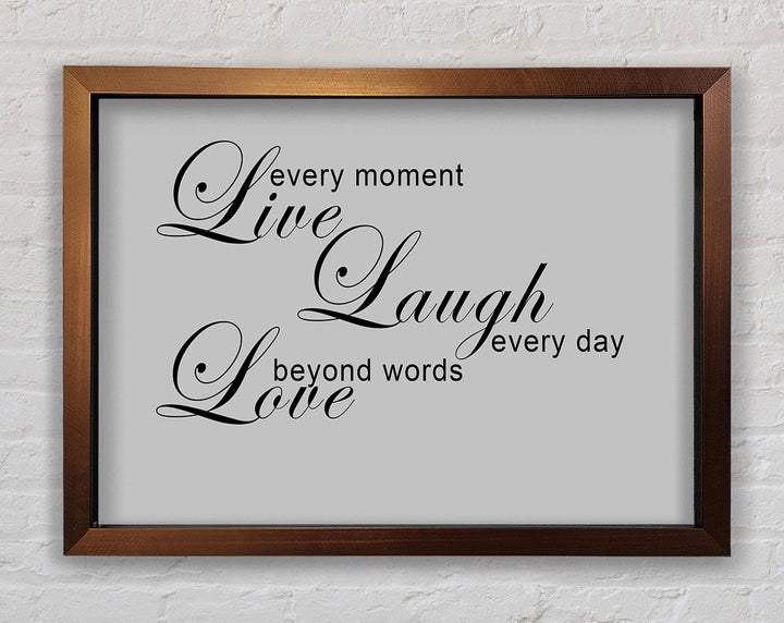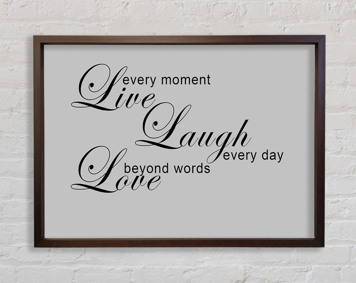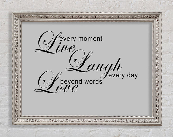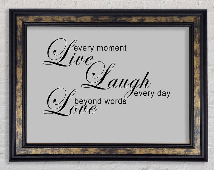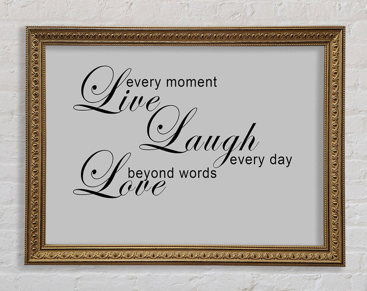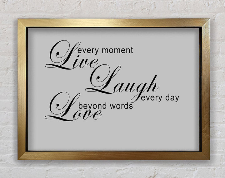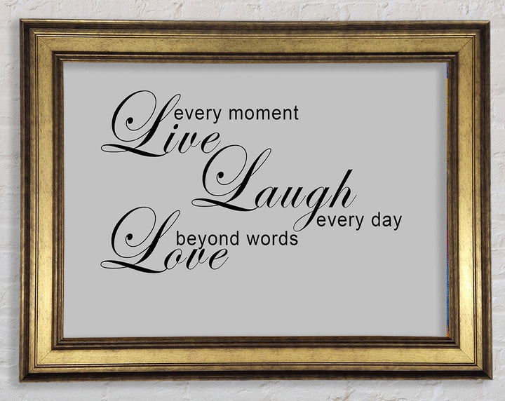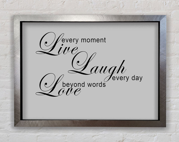 Liebeszitat „Live Every Moment 3“ – Grau gerahmter Druck, in mehreren Rahmenfarben erhältlich. Fertig zum Aufhängen aus der Schachtel und handgefertigt im Vereinigten Königreich.