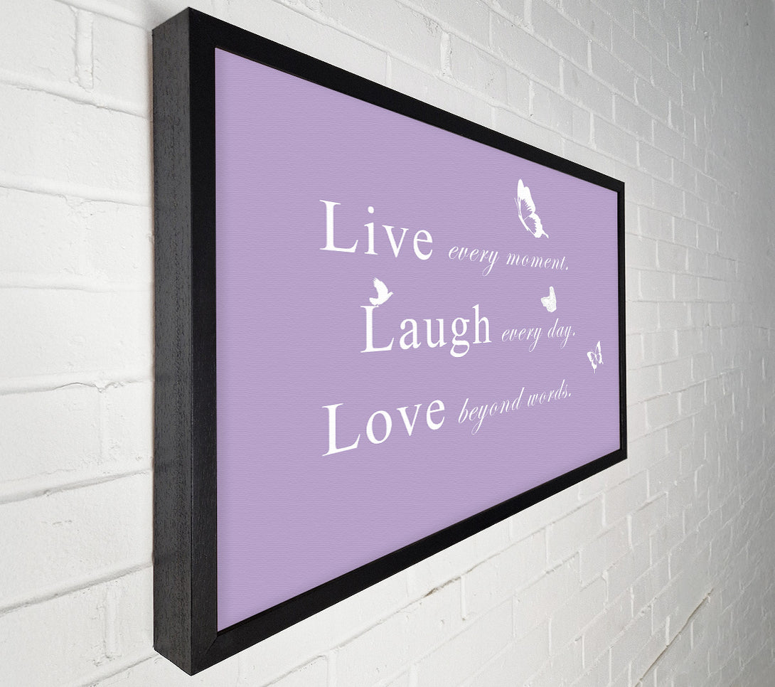 Brighten up your home with the Love Quote Live Every Moment Lilac Canvas Print. This lovely wall art is perfect for adding a touch of inspiration to any room. The canvas features a calming lilac background with an uplifting message: "Live Every Moment, Laugh Every Day, Love Beyond Words." Crafted with high-quality materials, it ensures durability and a stunning look that lasts.