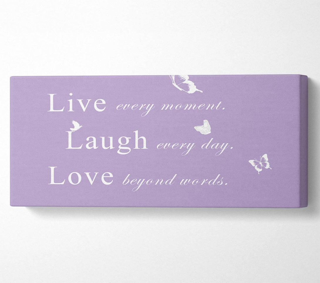 Liebeszitat „Live Every Moment“ auf lila Leinwand, gedruckt auf beschichteter Polyester-Leinwand. Auf einem 44 mm großen Kastenrahmen montiert, fertig zum Aufhängen.