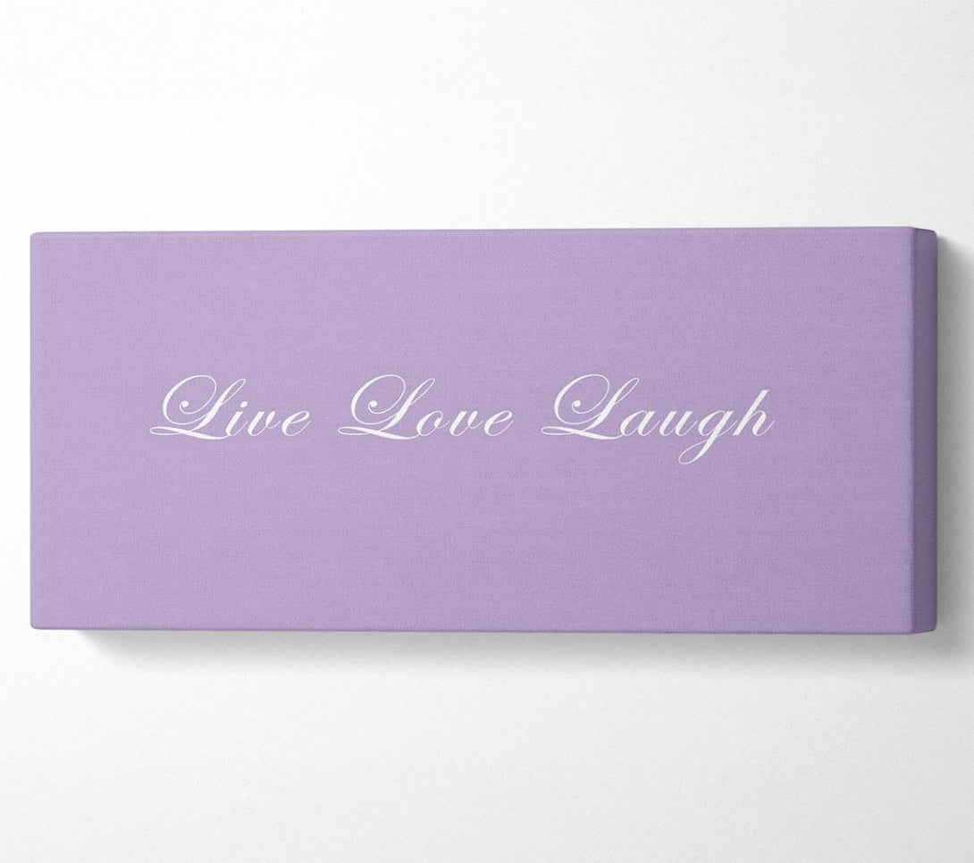 Liebeszitat „Live Love Laugh 2“ auf lila Leinwand, gedruckt auf beschichteter Polyester-Leinwand. Auf einem 44 mm großen Kastenrahmen montiert, fertig zum Aufhängen.