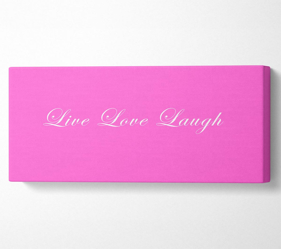 Liebeszitat „Live Love Laugh 2“ – Leinwand in leuchtendem Pink, gedruckt auf beschichteter Polyester-Leinwand. Auf einem 44 mm großen Kastenrahmen montiert, fertig zum Aufhängen.