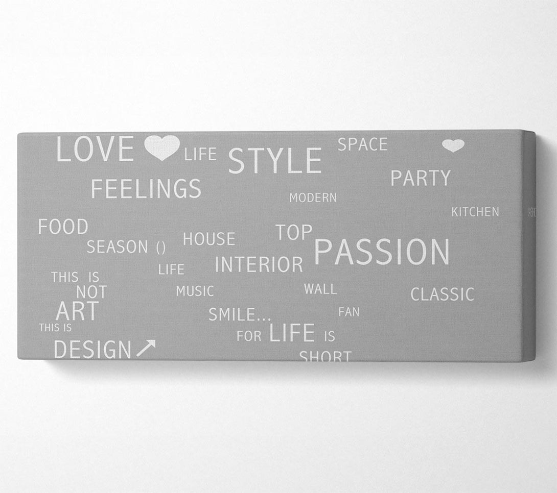 Liebeszitat „Love Life“ auf grauweißer Leinwand, gedruckt auf beschichteter Polyester-Leinwand. Auf einem 44 mm großen Kastenrahmen montiert, fertig zum Aufhängen.