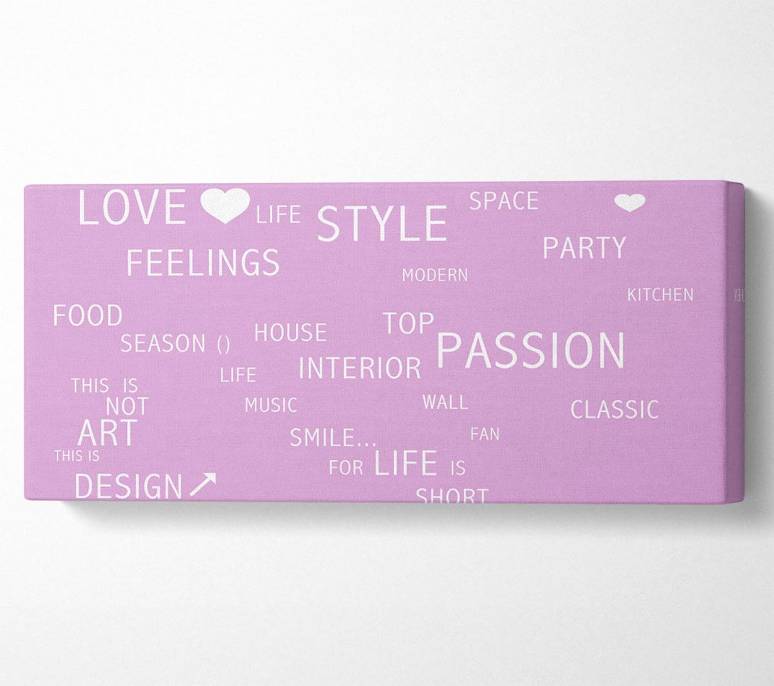 Liebeszitat „Love Life“ auf rosa Leinwand, gedruckt auf beschichteter Polyester-Leinwand. Auf einem 44 mm großen Kastenrahmen montiert, fertig zum Aufhängen.