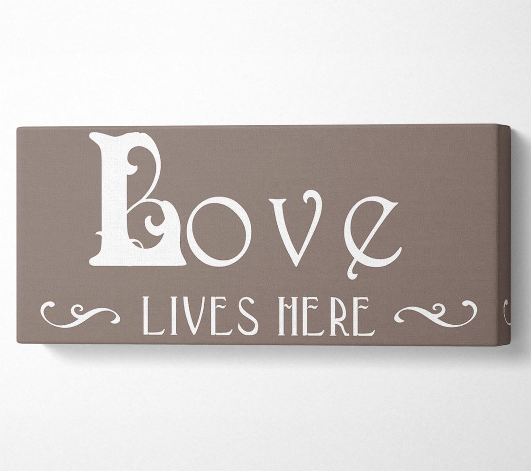 Liebeszitat „Love Lives Here Vines“ auf beigefarbener Leinwand, gedruckt auf beschichteter Polyester-Leinwand. Auf einem 44 mm breiten Kastenrahmen montiert, fertig zum Aufhängen.