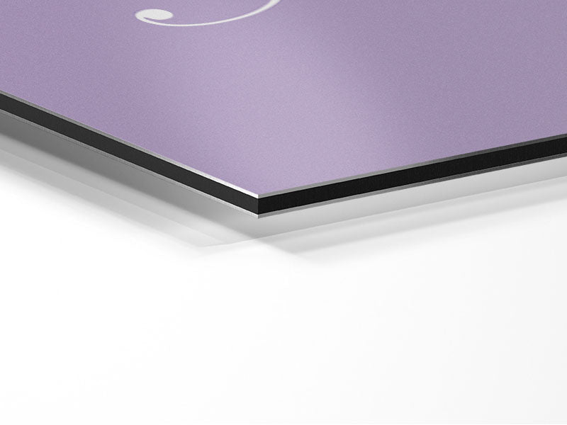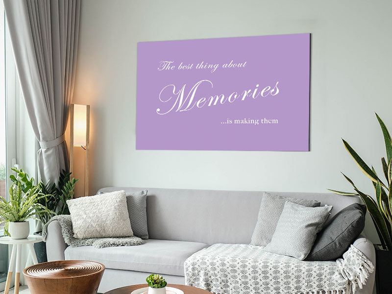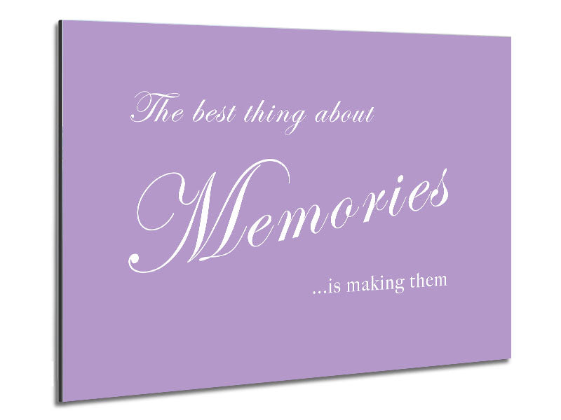 Liebeszitat „Das Beste an Erinnerungen“ in Lila. Gedruckt auf gebürstetem Aluminium-Dibond. Eine moderne Art, Kunst zu präsentieren und leicht zu pflegen.