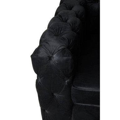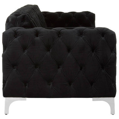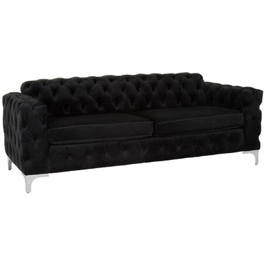This sofa makes a statement with its distinctive quilted design and bold black palette. The seats are left unquilted to contrast and the black velvet upholstery creates a luxurious finish. Its feet are made from metal and have a reflective silver finish.