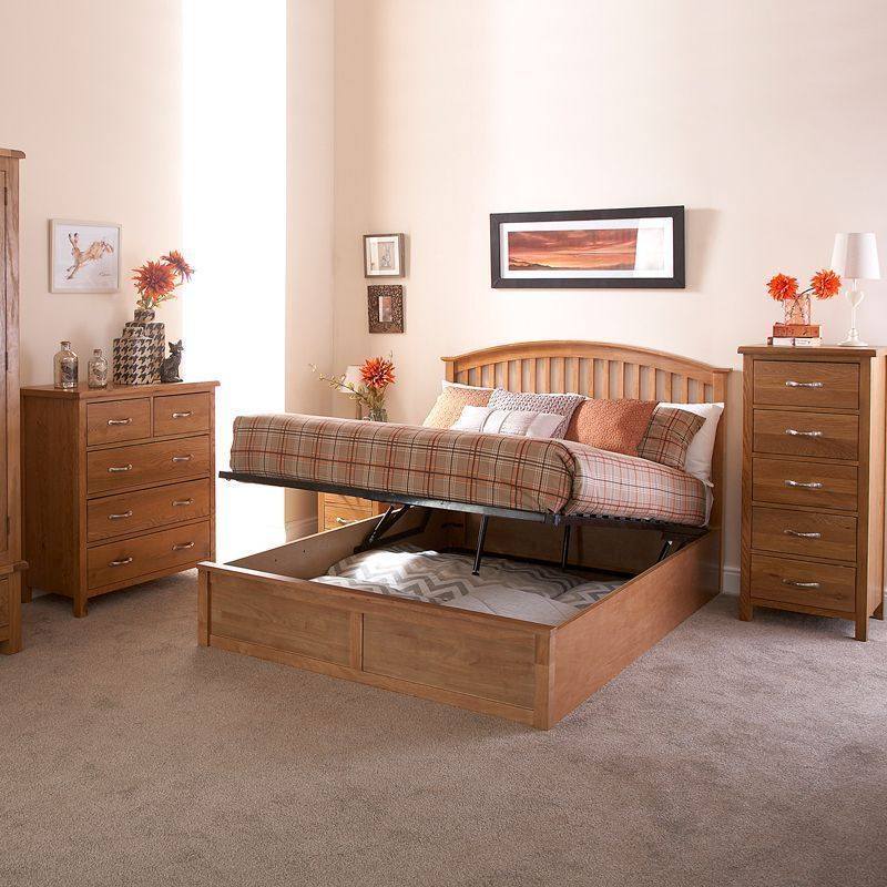 This ottoman bed from GFW offers magnificent aesthetics and faultless functionality and is ideal for those who love to sit back and enjoy a thoughtfully-planned living space. An ottoman bed is great way to save space with practical and convenient storage for all duvets, pillows and bed linen, this piece will provide an outstanding enhancement to your sleeping area. Pleasing and versatile natural tones will fit in beautifully anywhere. Will comfortably accommodate two adults. A great all-rounder for one or two people or for your guest room. Madrid has a country artisan look and feel with its plank-and-panel-effect boxed base and tall, gently arched spindle headboard and theres a practical side to Madrid. The sprung mattress base can be easily lifted at the foot end to reveal a deep storage space thats designed to accommodate quilts, cushions and extra bedding or whatever needs to be stashed away out of sight.
