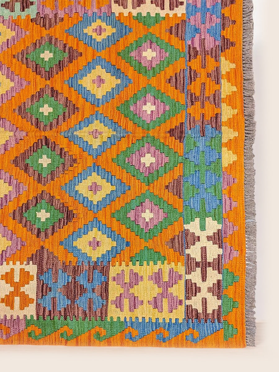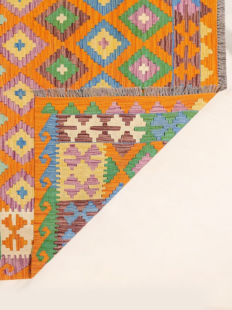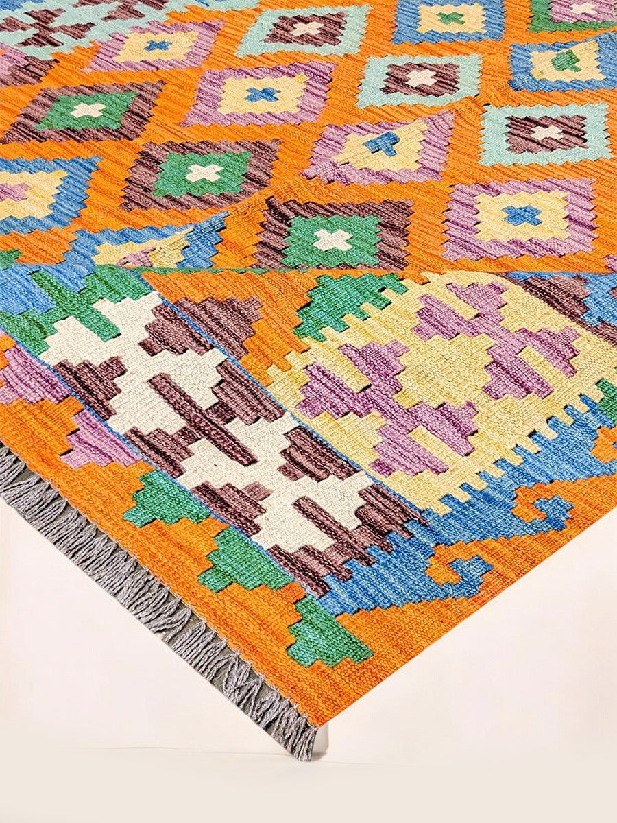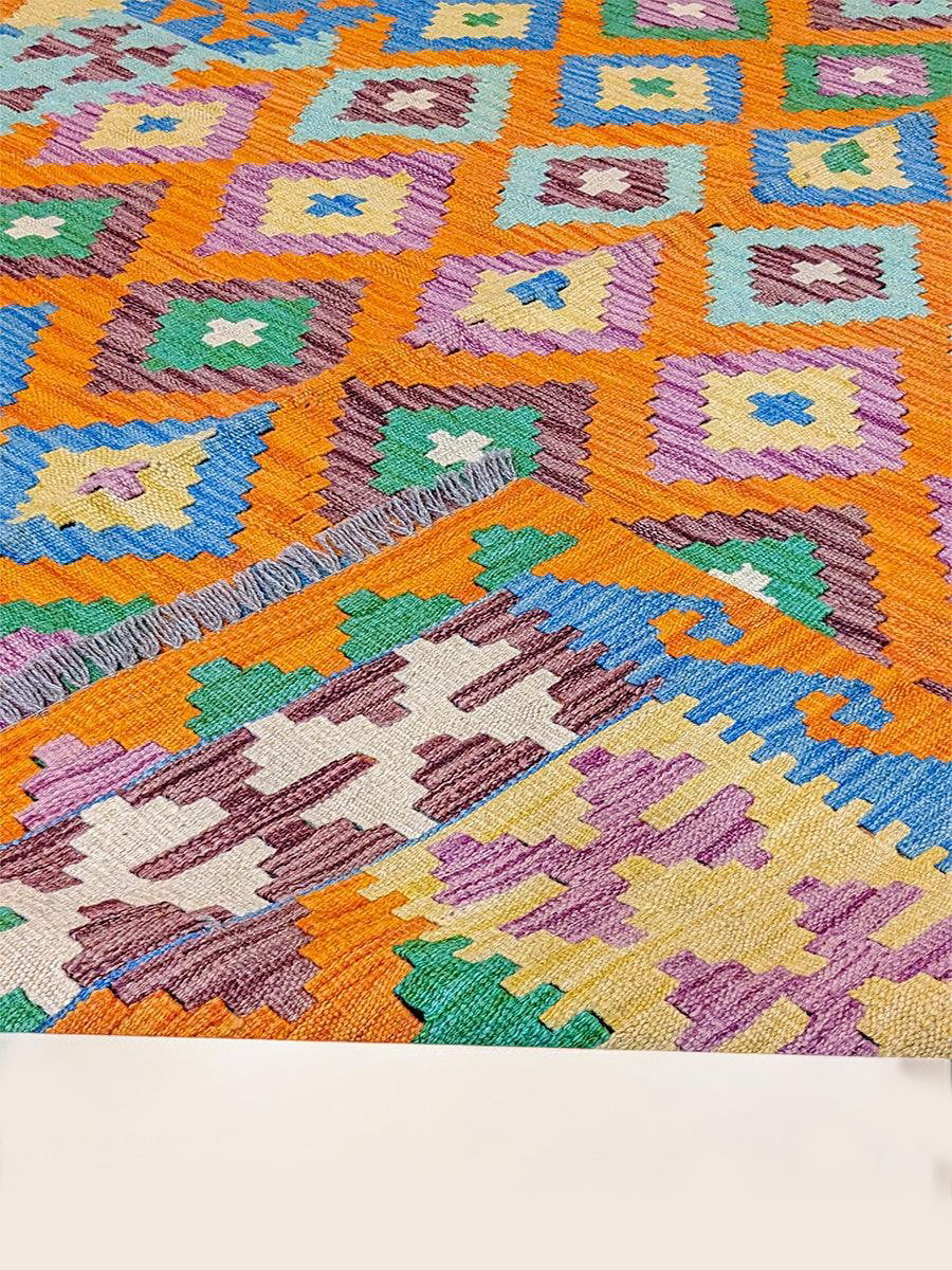 This Afghan Kilim Rug doesn’t just sit on your floor—it sings. Imagine Afghan weavers, fingers stained with pomegranate dyes, looping stories of mountain horizons into every thread. The fiery orange base? That’s a desert sunset trapped in wool. The sapphire zigzags and emerald chevrons? Those are nomadic trails, mapped in color. Lightweight enough to toss over a reading nook chair, yet tough enough to handle casual strolls.