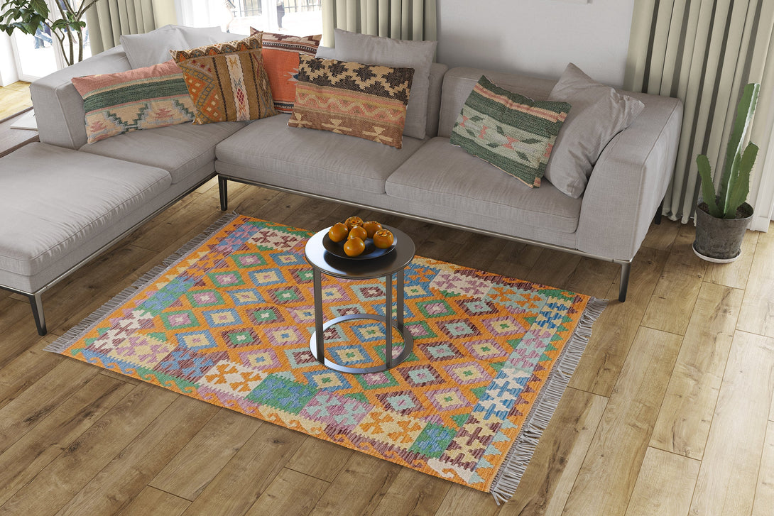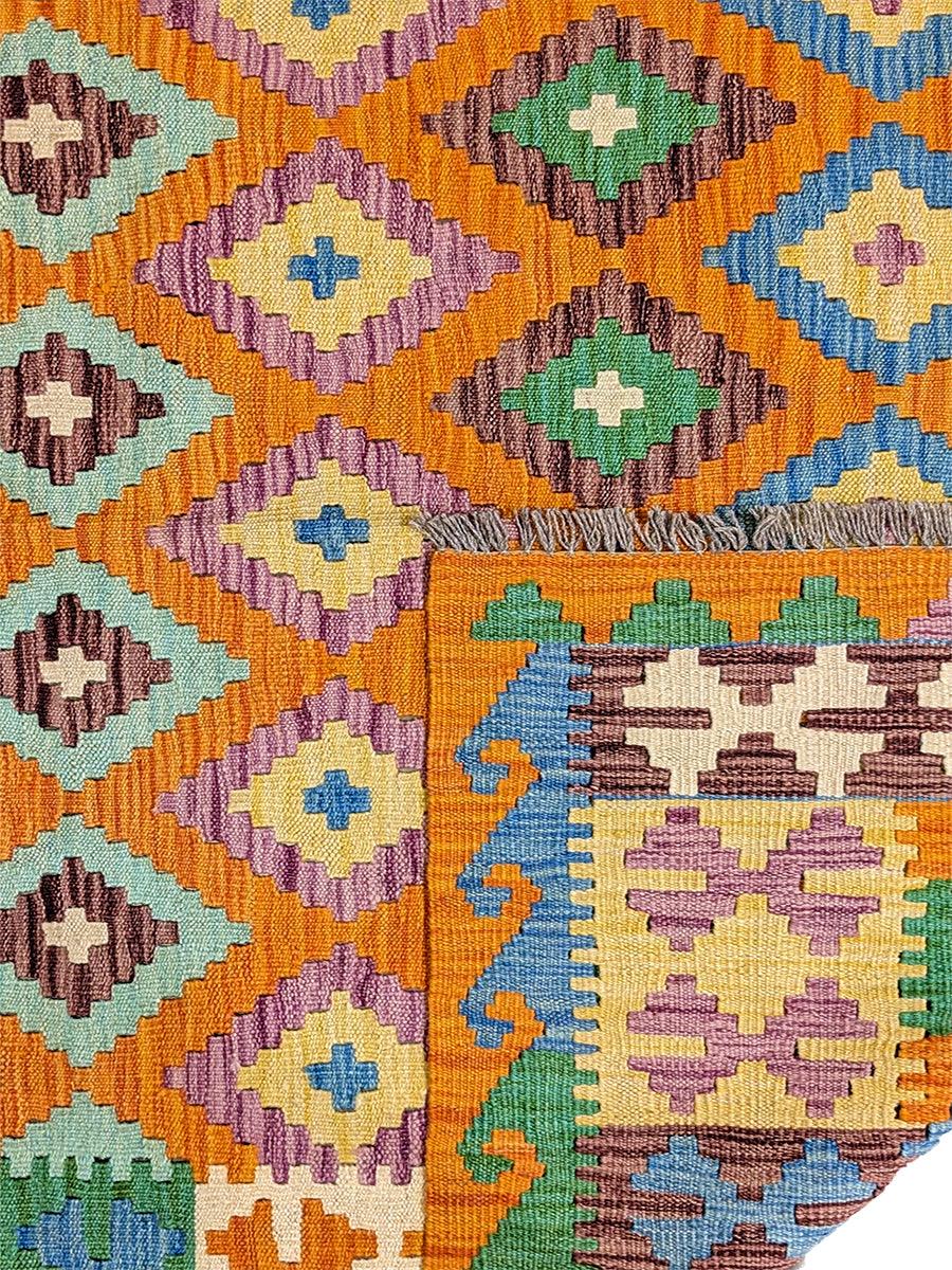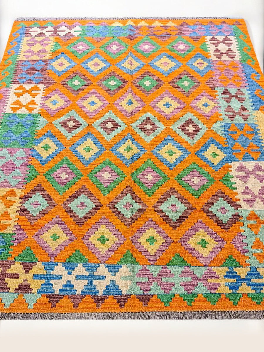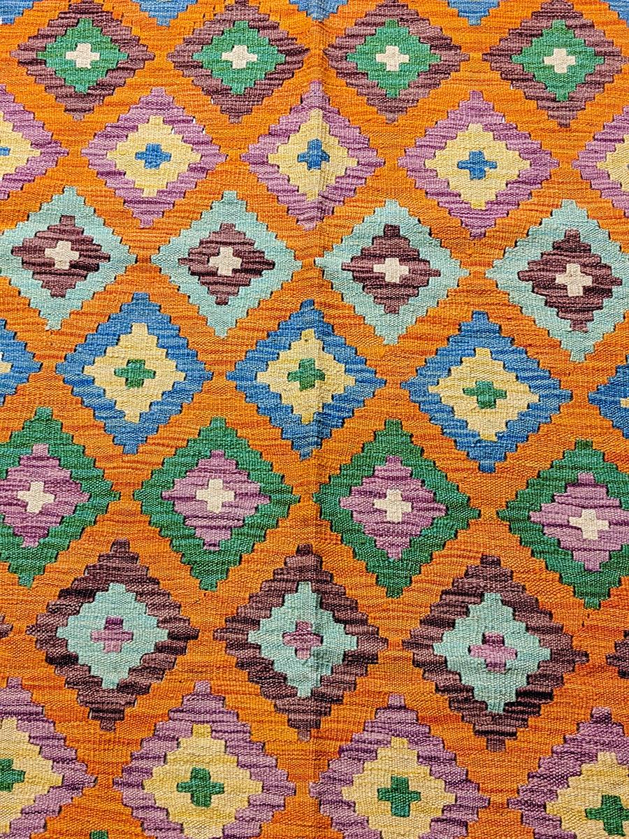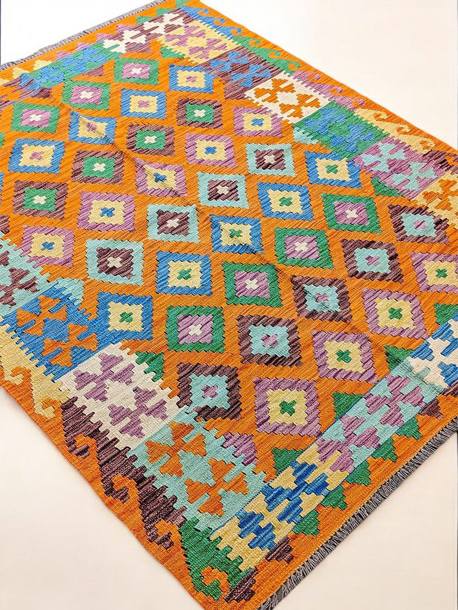 This Afghan Kilim Rug doesn’t just sit on your floor—it sings. Imagine Afghan weavers, fingers stained with pomegranate dyes, looping stories of mountain horizons into every thread. The fiery orange base? That’s a desert sunset trapped in wool. The sapphire zigzags and emerald chevrons? Those are nomadic trails, mapped in color. Lightweight enough to toss over a reading nook chair, yet tough enough to handle casual strolls.