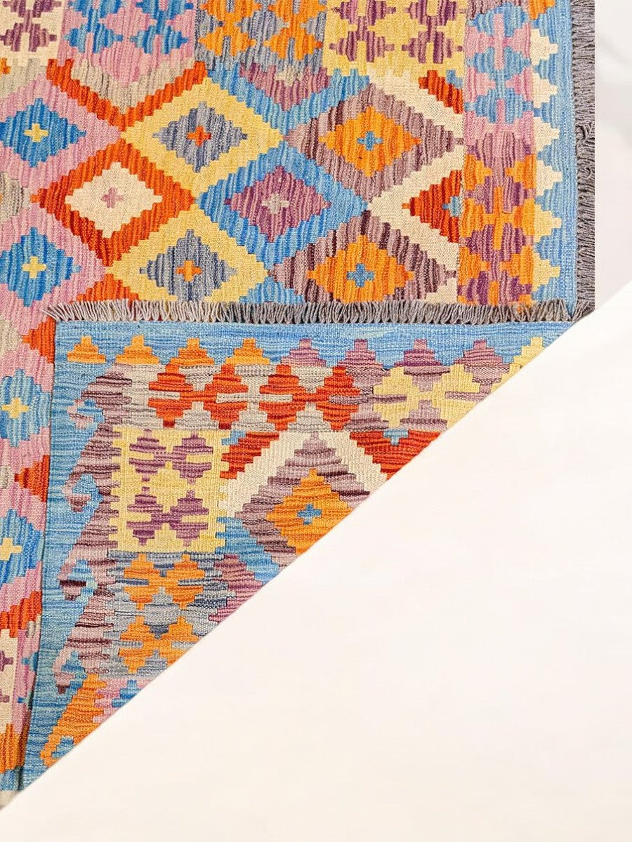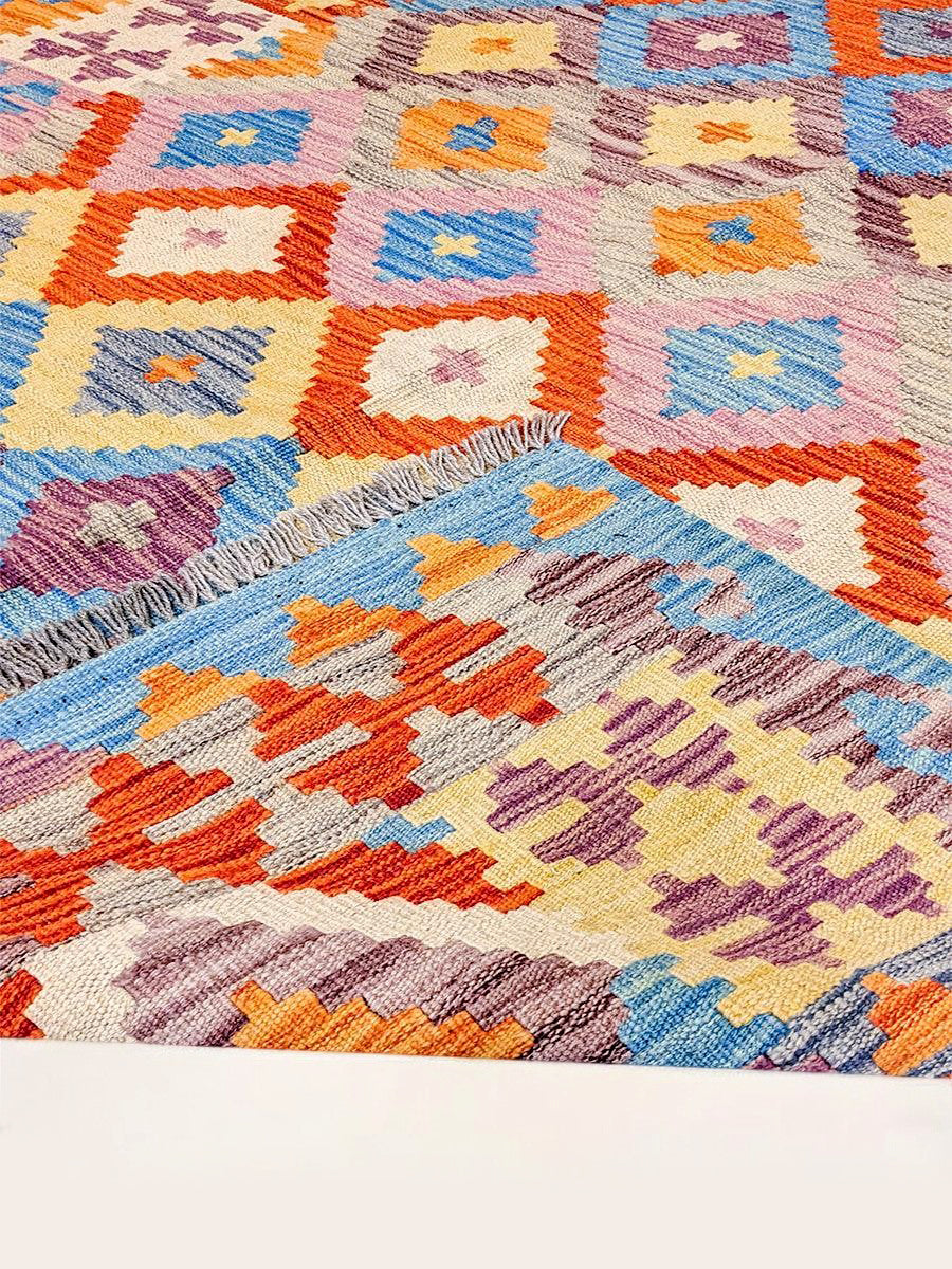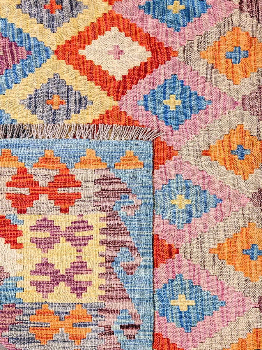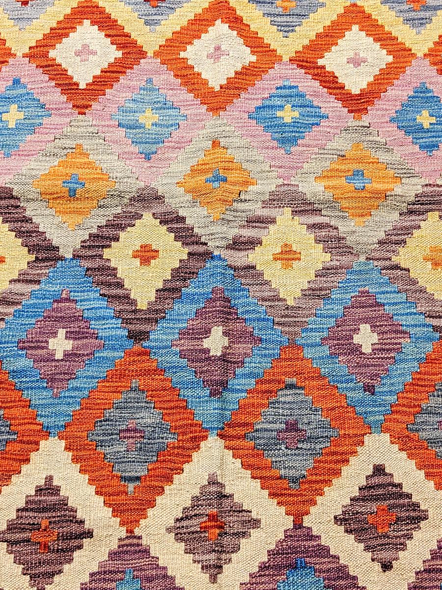Discover the beauty of simplicity with this handwoven Afghan Kilim Rug. Unlike traditional pile rugs, this flatweave piece offers a sleek, low-profile design that's perfect for both modern and classic interiors. The intricate geometric patterns, characteristic of Afghan craftsmanship, are brought to life through a vibrant palette that's a testament to the power of color.