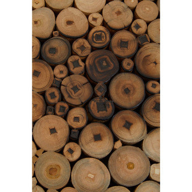 Boasting ample rustic warmth and sophistication, this set of three tables with top in interlinked teak plugs will update a modern statement. Each table rests above a sleek and minimal black iron base.