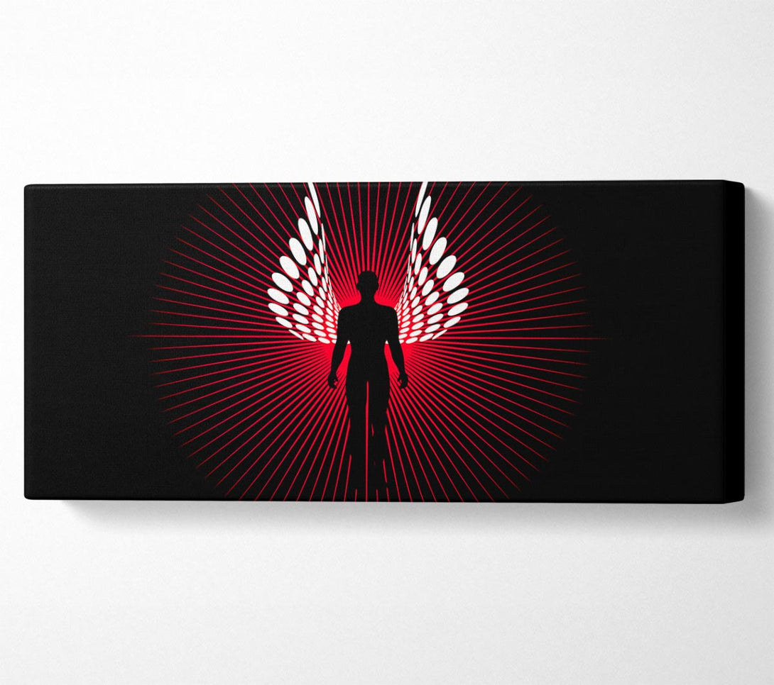Rote Leinwand mit männlichen Engelsflügeln, gedruckt auf beschichteter Polyester-Leinwand. Auf einem 44 mm großen Kastenrahmen montiert, fertig zum Aufhängen.