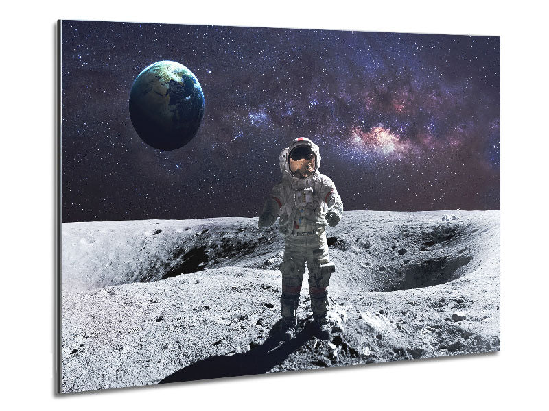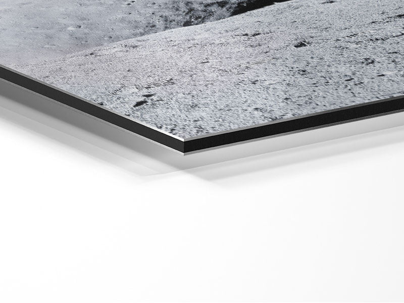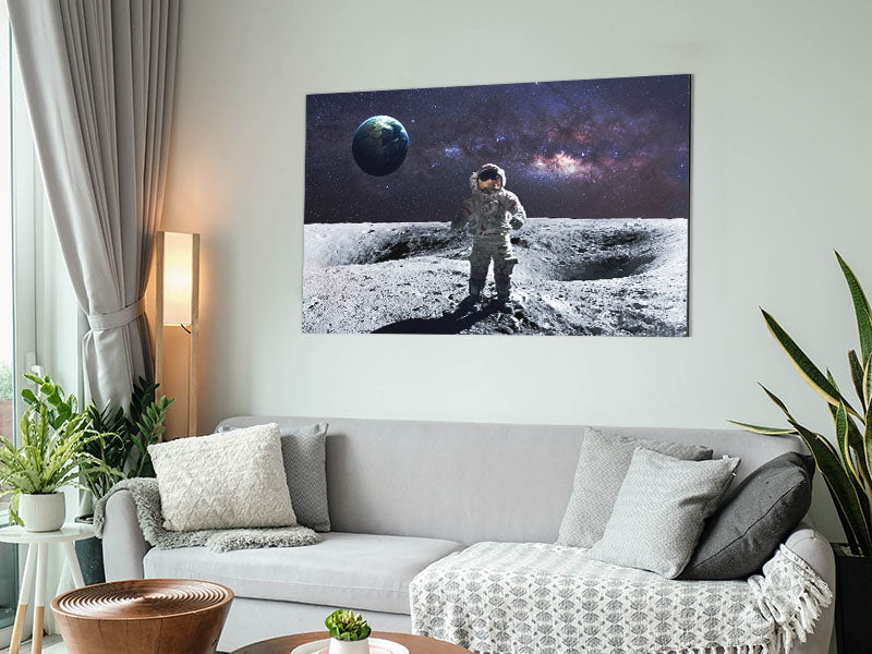 Mann im Mond. Gedruckt auf gebürstetem Aluminium-Dibond. Eine moderne Art, Kunst zu präsentieren und leicht zu pflegen.