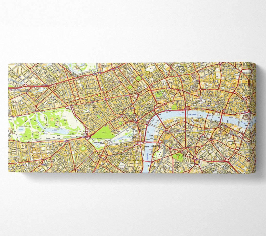 Karte von London auf Leinwand, gedruckt auf beschichteter Polyester-Leinwand. Auf einem 44 mm großen Kastenrahmen montiert, fertig zum Aufhängen.