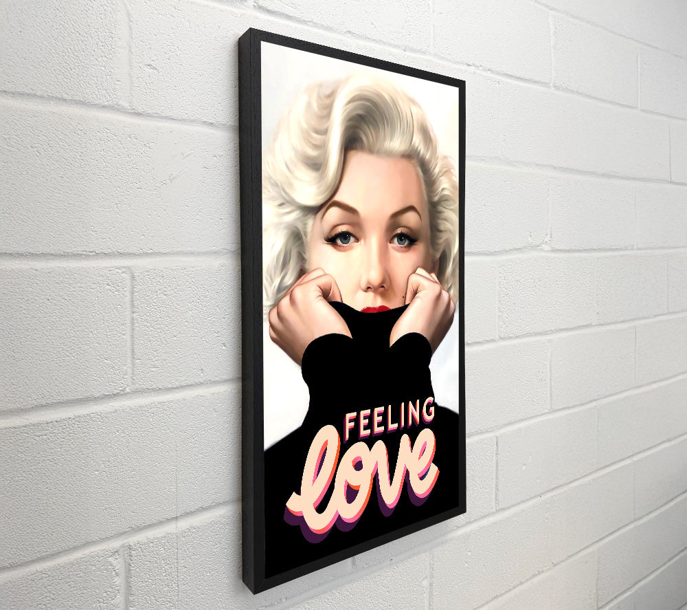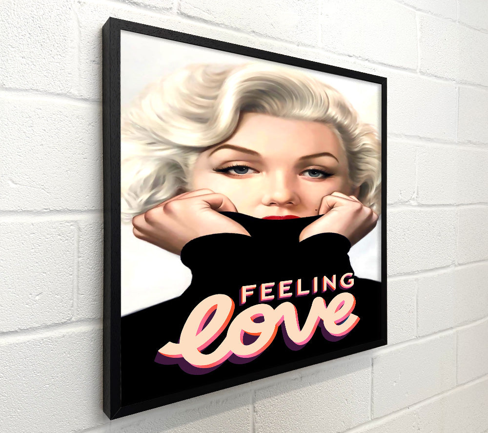 Marilyn Monroe Feeling Love, quadratische Leinwand, gedruckt auf beschichteter Polyester-Leinwand. Auf einem 44 mm großen Kastenrahmen montiert, fertig zum Aufhängen.