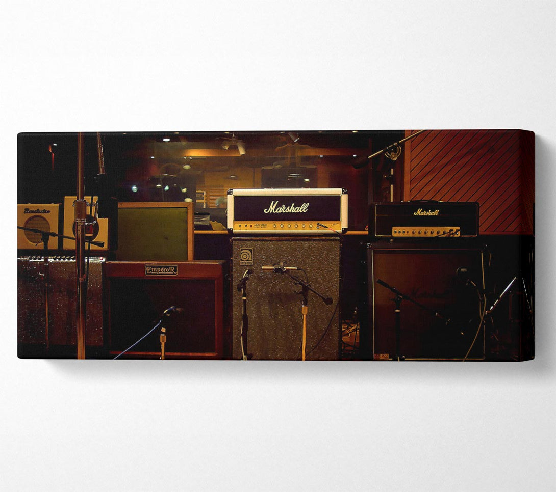 Leinwandbild mit Marshall-Lautsprechern, gedruckt auf beschichtetem Polyester-Canvas. Auf einem 44 mm großen Kastenrahmen montiert, fertig zum Aufhängen.